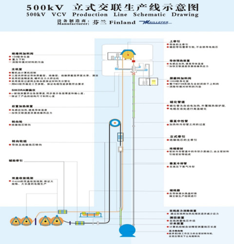 全:整套引進芬蘭麥拉菲爾(MAILLEFER)公司500kV立式交聯(lián)生產(chǎn)線,設備功能齊全,生產(chǎn)線全線由計算機自動控制。設備包括雙放裝置、放線輔助牽引、儲線器、上牽引機、重力下料裝置、前置導體預熱器、內(nèi)屏擠出機(60機)、絕緣擠出機(200機)、外屏擠出機(80機)、MOTAN材料處理系統(tǒng)、三層共擠機頭、偏心測量儀、后置導體預熱器、計算機控制系統(tǒng)、交聯(lián)管道、中性管道、氣水分離器、冷卻管道、U型壓力回轉(zhuǎn)導輪、在線松弛段、下封閉、下牽引機、電纜測徑儀、雙收線裝置等。